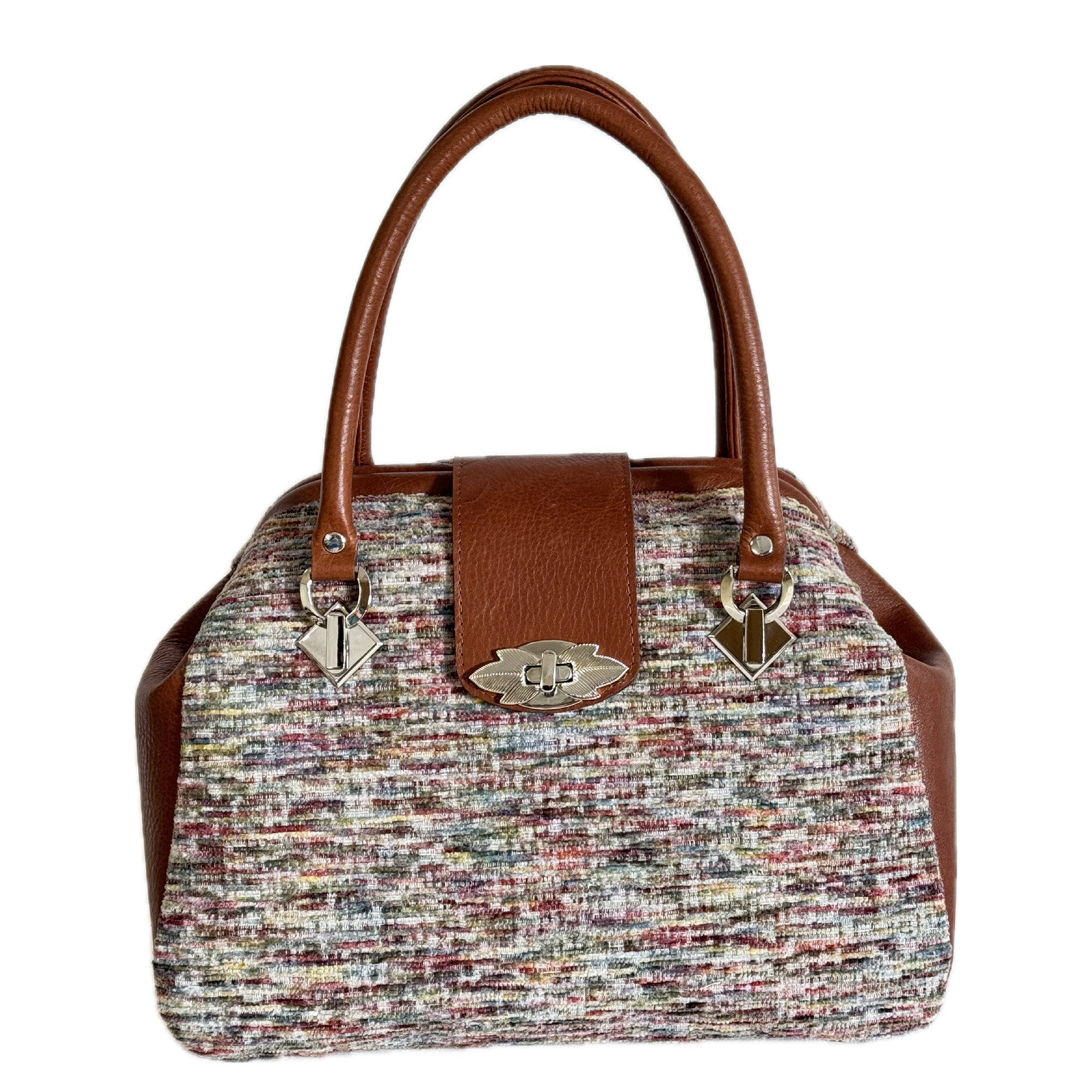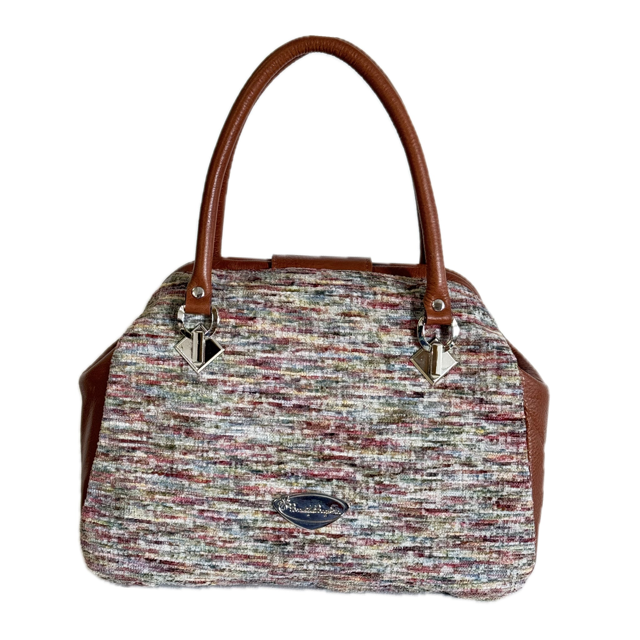 For the woman who styles a vintage flair, Annabelle Doctor Bag is a perfect fit.  A rich bourbon brown full grain cowhide leather trim complements a classic look of the 50’s in this soft multi-color tweed chenille tapestry.