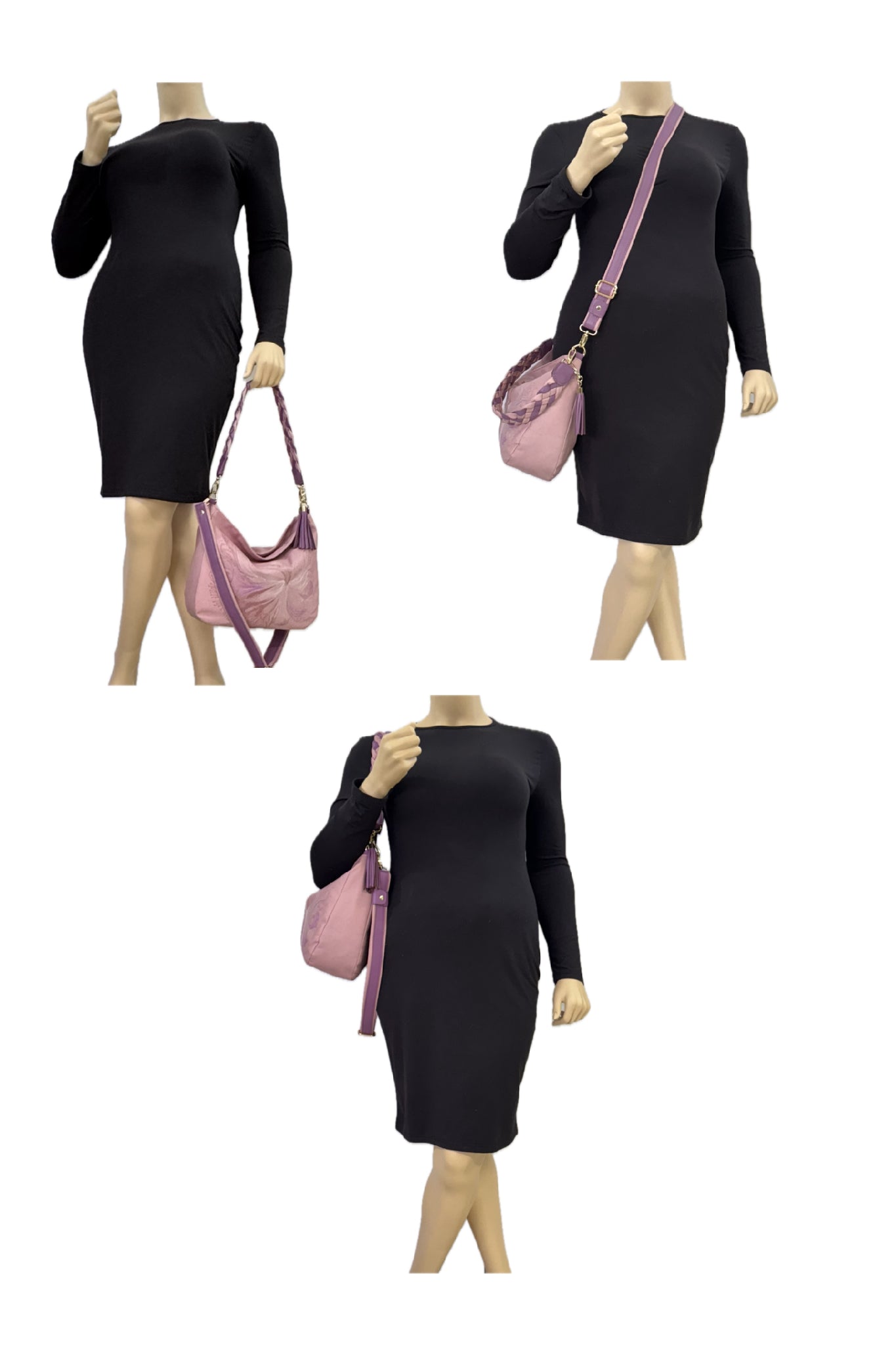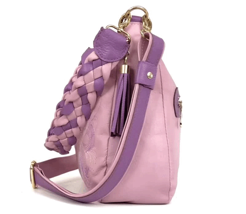 Shoulder Carry: Features an extra-wide, two-tone braided leather handle (powder pink and orchid) attached by gold-tone sturdy swivel hooks and D-rings for comfortable, over-the-shoulder wear.