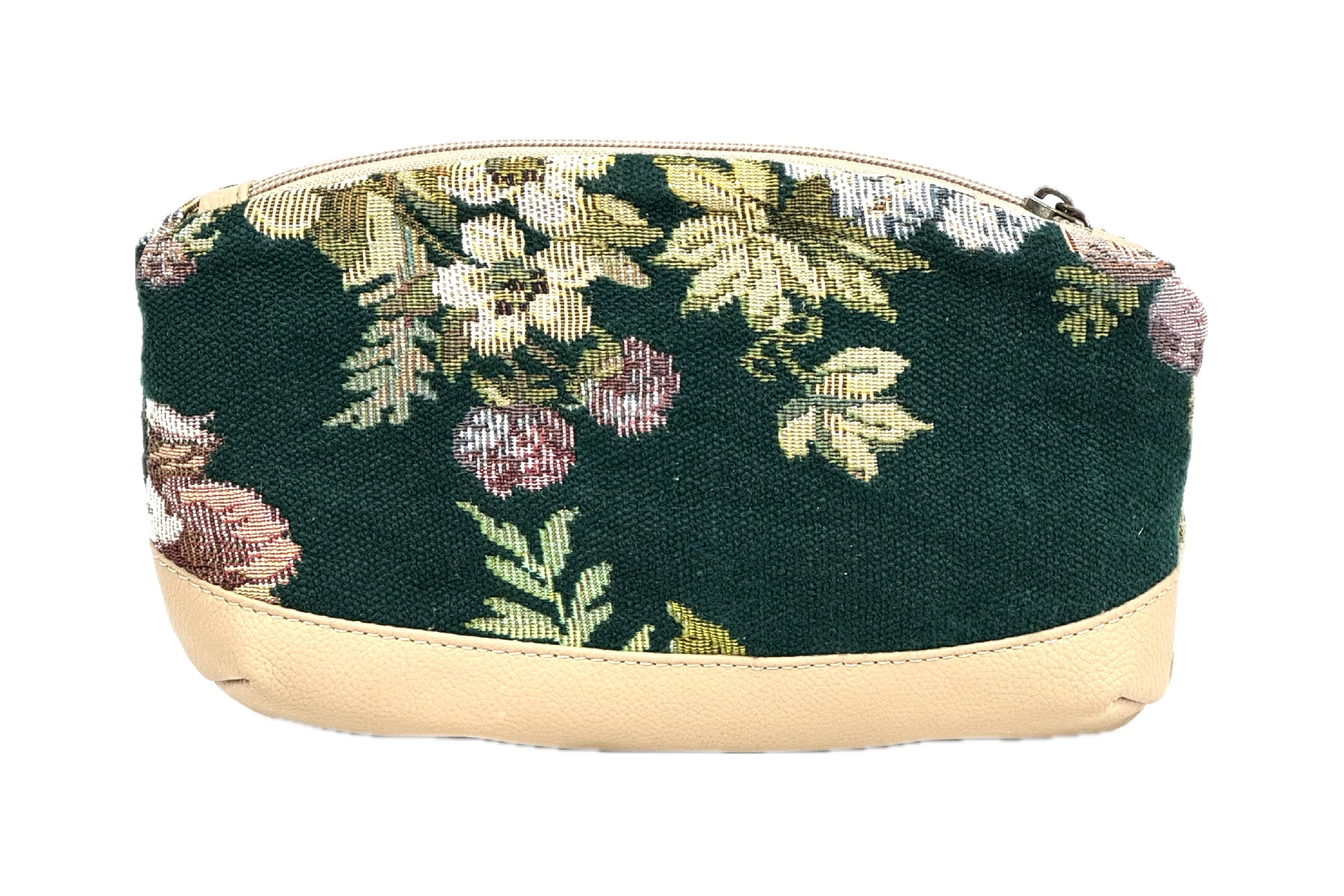 This charming small zipper pouch combines classic texture with durable materials, featuring a lush floral tapestry woven on a deep emerald green wool base.