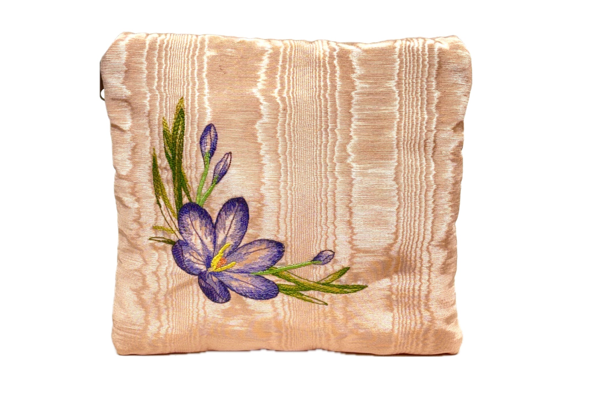 This sophisticated Peach Moiré Zipper Pouch features an elegant crocus floral embroidery on the front, adding a touch of botanical charm to its unique design. Crafted from a shimmering peach moiré fabric, the exterior is softly padded to provide extra protection for delicate items.